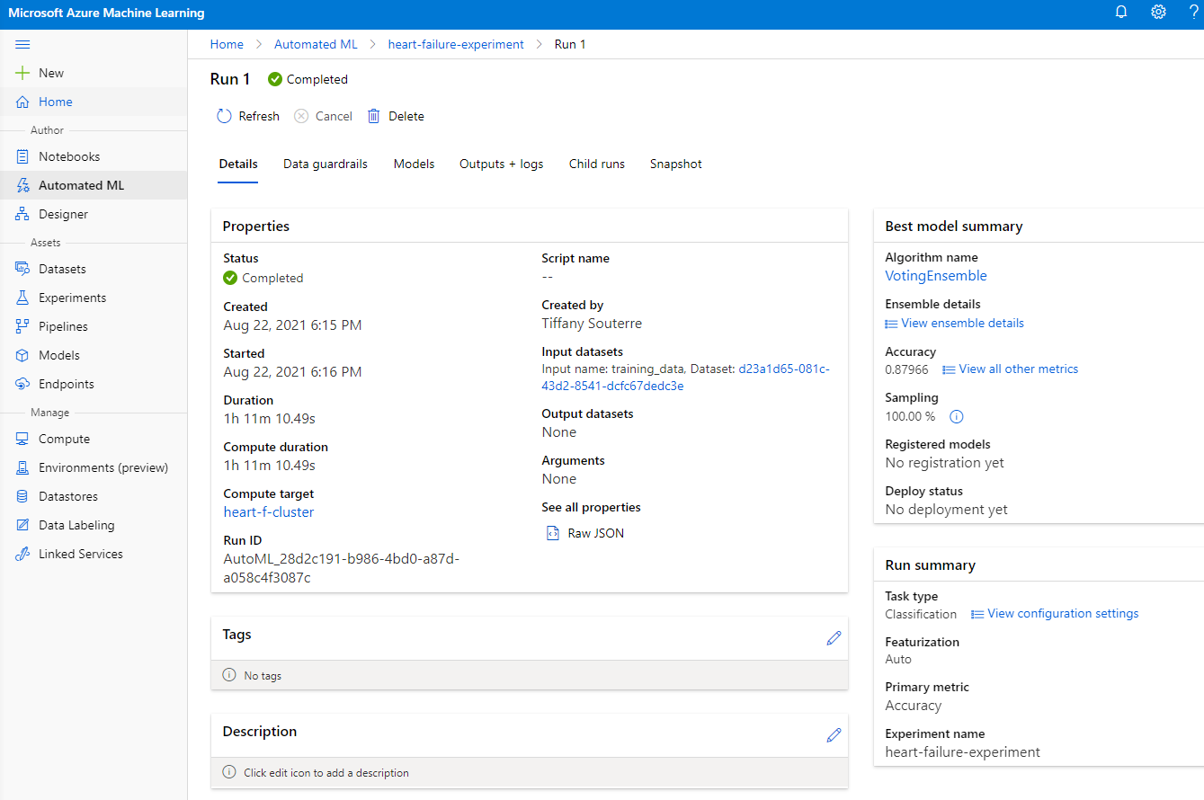 Here you can see the detailed description of the best model that AutoML generated. You can also explore other modes generated in the Models tab. Take a few minutes to explore the models in the Explanations (preview button). Once you have chosen the model you want to use (here we will chose the best model selected by autoML), we will see how we can deploy it.