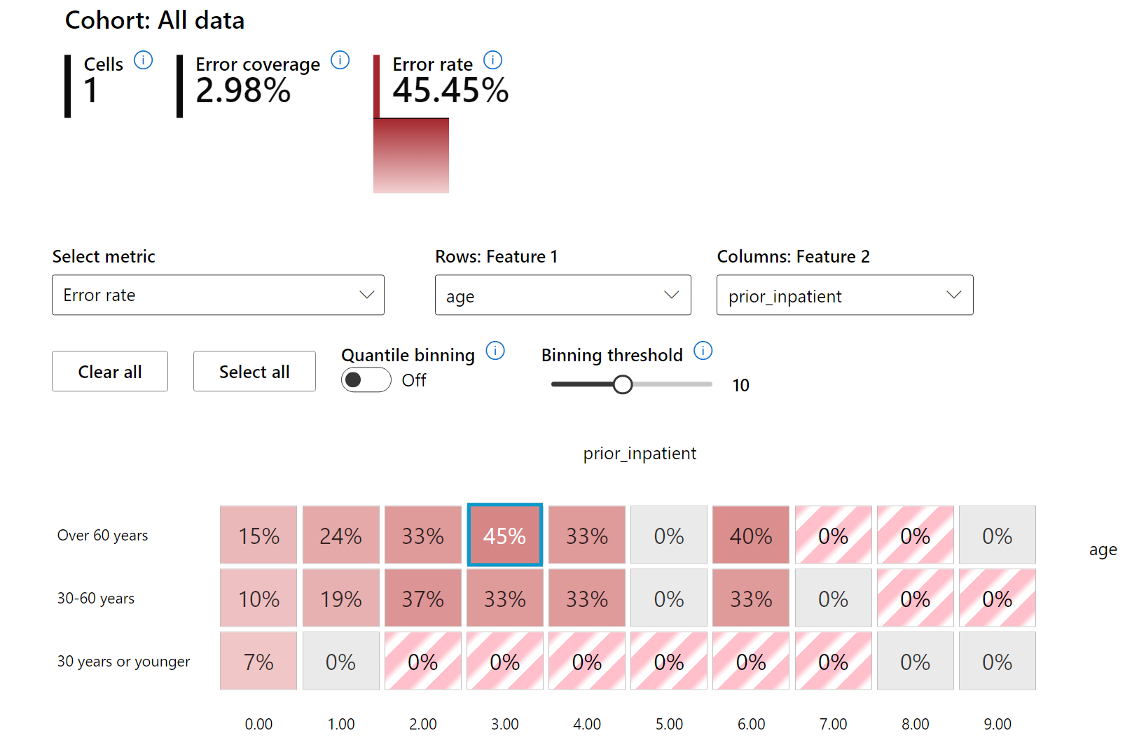 وظيفة التحليل القائمة على الميزات للمكون تسمح للمستخدمين بتضييق مجموعات البيانات الفرعية داخل ميزة معينة لتحديد الشذوذ على مستوى دقيق. على سبيل المثال، تحتوي لوحة القيادة على ذكاء مدمج لتوليد مجموعات تلقائيًا لميزة يختارها المستخدم (مثل "time_in_hospital < 3" أو "time_in_hospital >= 7"). هذا يمكّن المستخدم من عزل ميزة معينة من مجموعة بيانات أكبر لرؤية ما إذا كانت مؤثرًا رئيسيًا في نتائج النموذج الخاطئة.