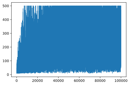 vector for further plotting. (code block 11)def probs(v,eps=1e-4): v = v-v.min()+eps v = v/v.sum() return v Qmax = 0 cum_rewards = [] rewards = [] for epoch in range(100000): obs = env.reset() done = False cum_reward=0 # == do the simulation == while not done: s = discretize(obs) if random.random()<epsilon: # exploitation - chose the action according to Q-Table probabilities v = probs(np.array(qvalues(s))) a = random.choices(actions,weights=v)[0] else: # exploration - randomly chose the action a = np.random.randint(env.action_space.n) obs, rew, done, info = env.step(a) cum_reward+=rew ns = discretize(obs) Q[(s,a)] = (1 - alpha) * Q.get((s,a),0) + alpha * (rew + gamma * max(qvalues(ns))) cum_rewards.append(cum_reward) rewards.append(cum_reward) # == Periodically print results and calculate average reward == if epoch%5000==0: print(f"{epoch}: {np.average(cum_rewards)}, alpha={alpha}, epsilon={epsilon}") if np.average(cum_rewards) > Qmax: Qmax = np.average(cum_rewards) Qbest = Q cum_rewards=[]