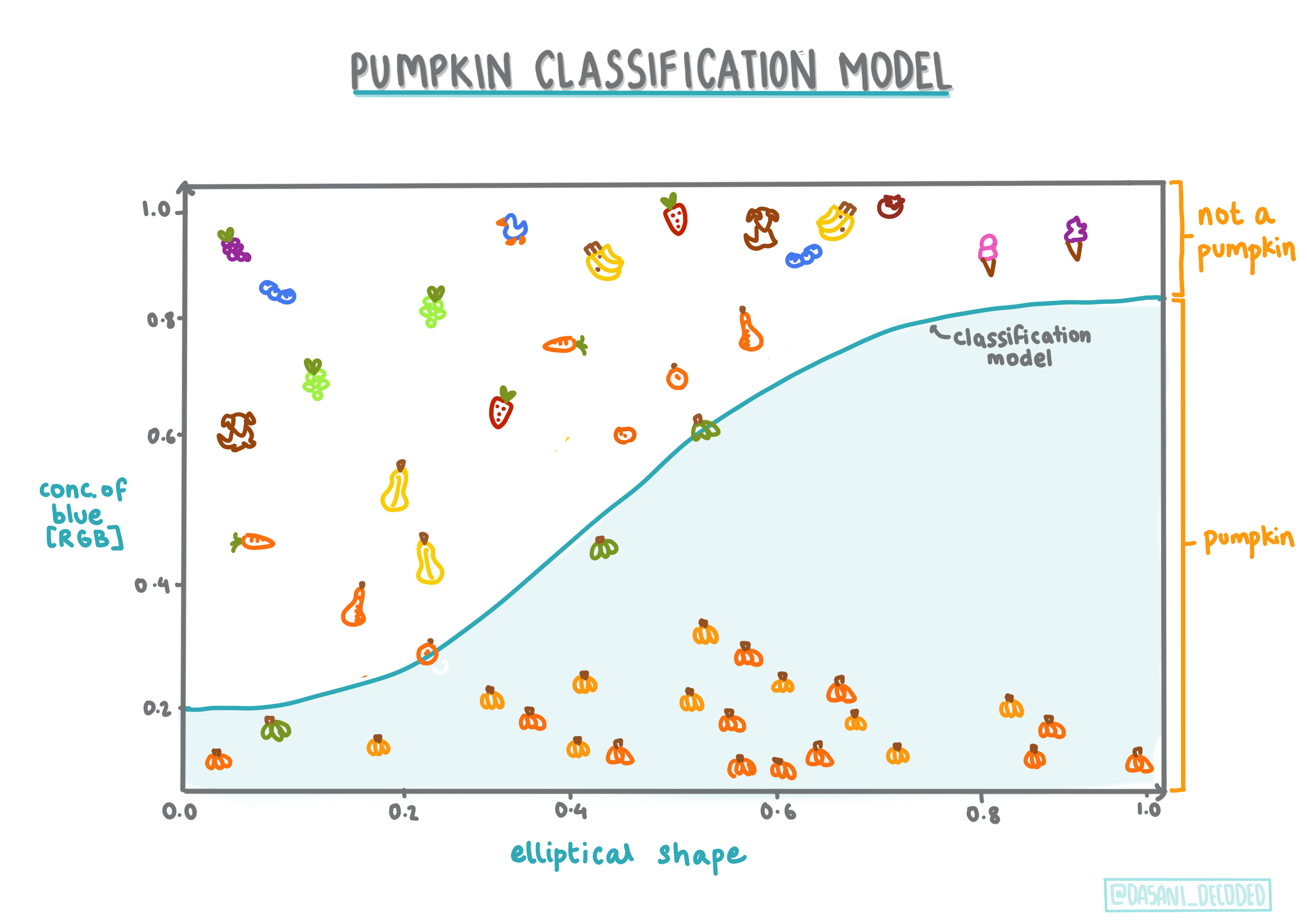 What's going on here? Let's say our model is asked to classify items between two binary categories, category 'pumpkin' and category 'not-a-pumpkin'.