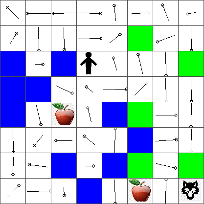 In our example, Peter's goal would be able to find an apple, while avoiding the wolf and other obstacles. To do this, he can essentially walk around until he finds an apple.