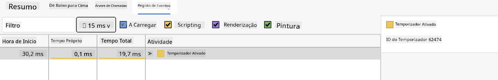 Verifica o painel de Registo de Eventos para ver se algum evento demorou mais de 15 ms: