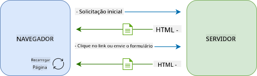 Sites tradicionais atualizam o conteúdo exibido quando o usuário seleciona um link ou envia dados usando um formulário, recarregando a página HTML inteira. Toda vez que novos dados precisam ser carregados, o servidor web retorna uma nova página HTML que precisa ser processada pelo navegador, interrompendo a ação atual do usuário e limitando as interações durante o recarregamento. Esse fluxo de trabalho também é chamado de Aplicação Multi-Página ou MPA.